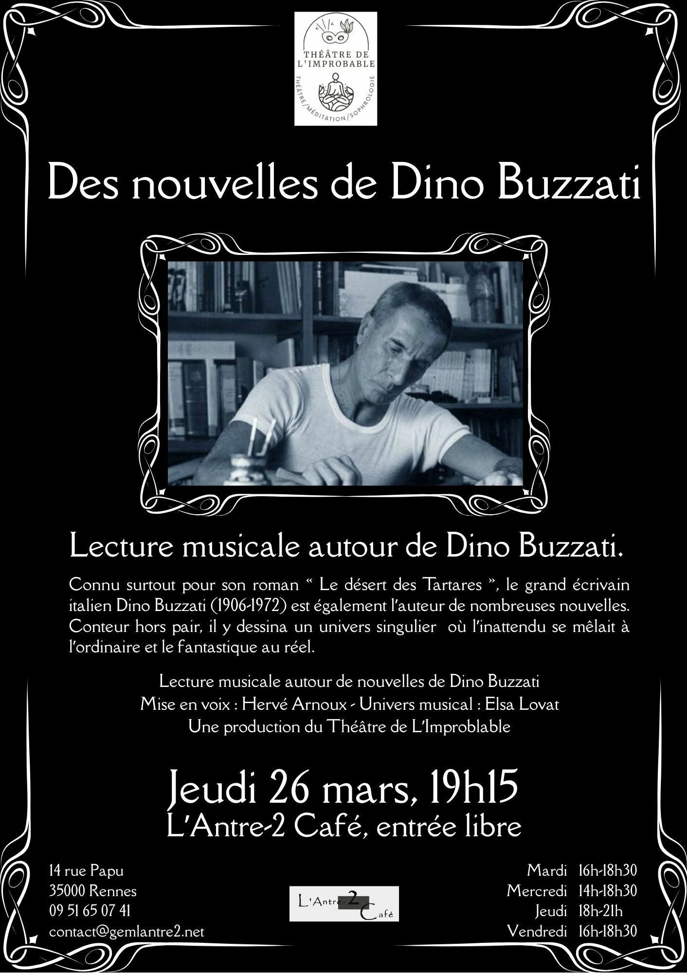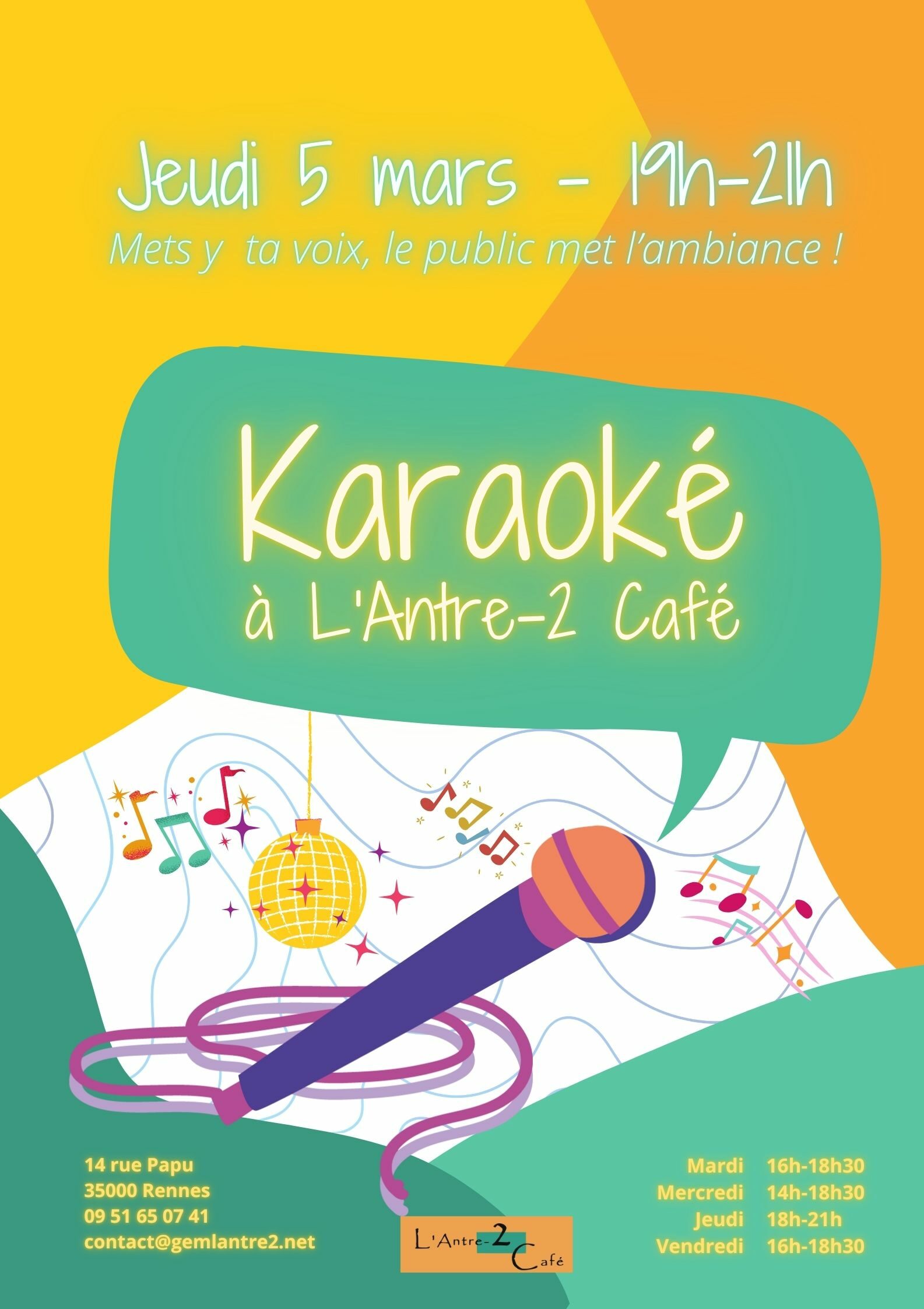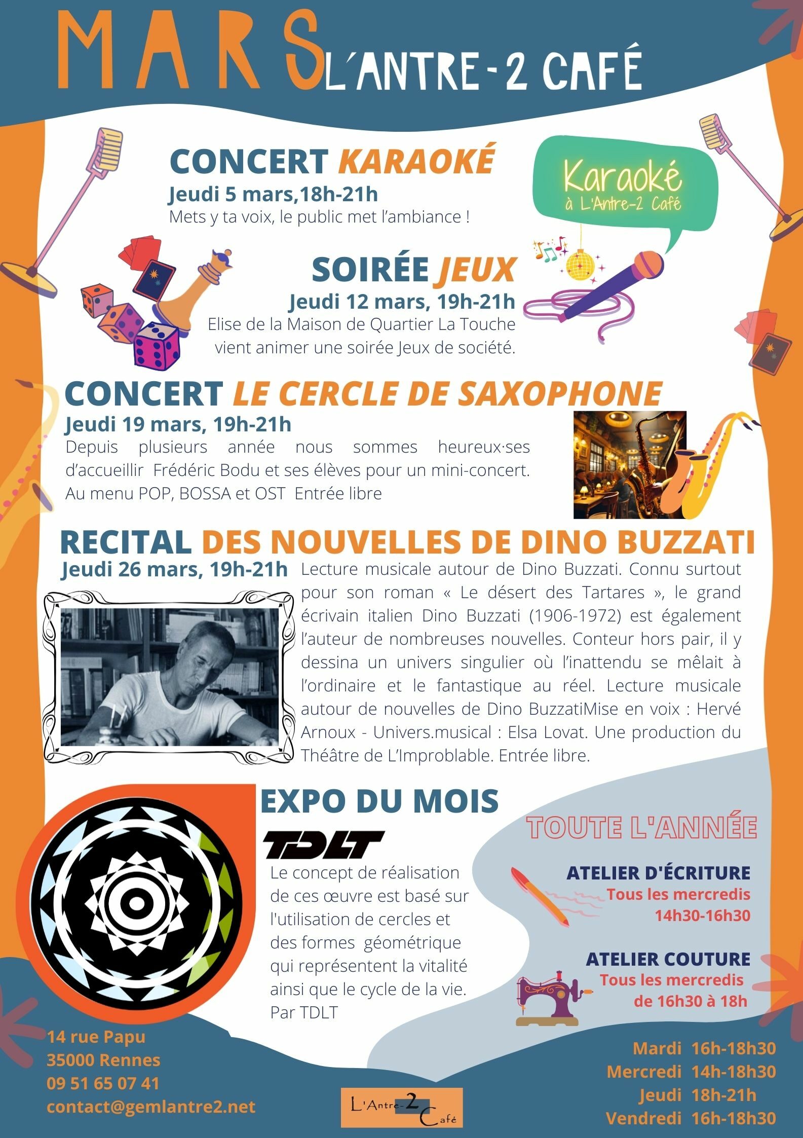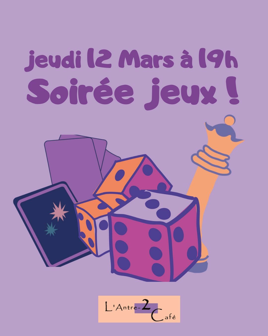 La programmation culturelle de L’Antre-2 Café c’est le jeudi soir entre 19h et 21h avec des concerts, du théâtre, des bœufs, des karaokés, des soirées jeux de société, repas partagés…